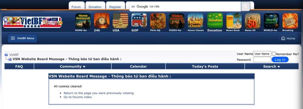 | Diễn Đàn Người Việt Hải Ngoại. Tự do ngôn luận, an toàn và uy tín. Vì một tương lai tươi đẹp cho các thế hệ Việt Nam hãy ghé thăm chúng tôi, hãy tâm sự với chúng tôi mỗi ngày, mỗi giờ và mỗi giây phút có thể. VietBF.Com Xin cám ơn các bạn, chúc tất cả các bạn vui vẻ và gặp nhiều may mắn. |