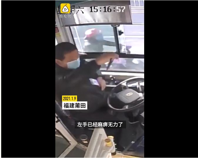 Tài xế xe buýt khi muốn thắt dây an toàn nhưng cánh tay trái đột nhiên tê liệt khiến tài xế phải nhờ trợ giúp, hôm 9/1 ở Phúc Kiến, Trung Quốc.