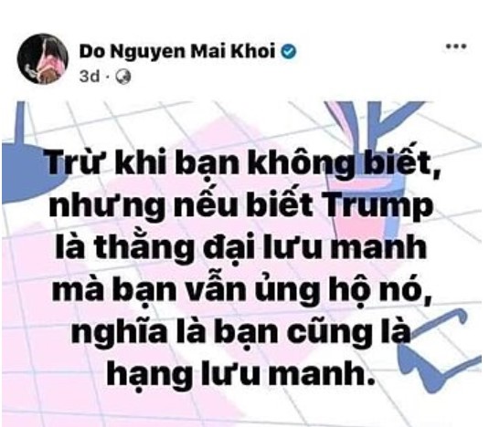 Người dẫn chương tŕnh hàng đầu của ABC,George Stephanopoulos đă tuyên bố ông Trump chịu trách nhiệm về việc hiếp dâm bà E. Jean Carroll. ABC cũng sẽ trả 1 triệu đô la cho ông Trump để trả phí luật sư. Đài ABC News và George Stephanopoulos phải công khai xin lỗi về những tuyên bố liên quan đến Tổng thống Donald J. Trump trong cuộc phỏng vấn của George Stephanopoulos với Dân biểu Nancy Mace trên chương tŕnh This Week của ABC vào ngày 10 tháng 3 năm 2024. Một số đài Việt ngữ cũng nói ông Trump là kẻ hiếp dâm không biết có chuẩn bị đủ tiền để ra ṭa hay chưa? Lôi đầu mấy con vẹt này ra bắt xin lỗi rồi bồi thường cho chúng chừa. ABC là hăng lớn th́ hăng chi tiền. C̣n mấy tên bố láo bố lếu này không biết lấy tiền ở đâu để bồi thường đây nữa chứ... haiz! Nếu có 1 vài tiếng nói bảo thủ dịch ra nội dung của bọn ve chó , theo đóm ăn tàn cho bạn lănh đạo của tông tông Trump , để ổng chơi cú rờ ve , cộng đám này vào đơn kiện ABC cho bọn chúng bỏ tật ăn đằng sóng nói đằng gió ! Lê Hoàng |