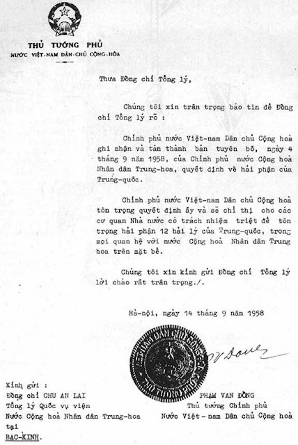 Ngụy?  Xin can đi. Lại dùng chữ sai bét nữa rồi. Có “ngụy” cách mấy đi chăng nữa, cũng không thể nào sánh với những kẻ “đào ngũ trước địch quân”. Tội lỗi này CAO hơn cả trời, SÂU hơn cả đất. PS: Mà cái "công hàm" có nói ǵ về Hoàng Sa Trường Sa đâu? Theo luật quốc tế, nước nào cũng có phạm vi 12 hải lư biển mà, nếu tui không lầm |