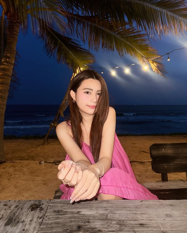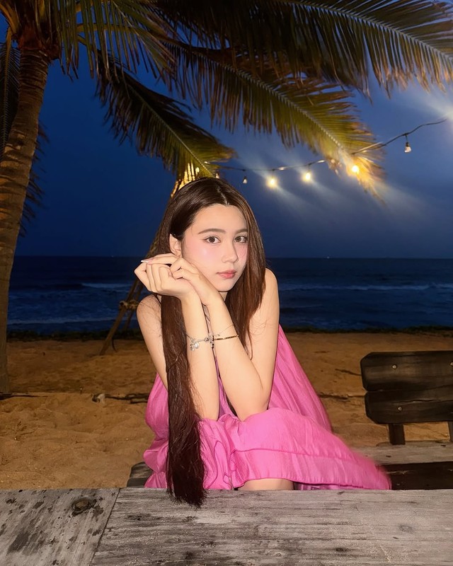 Nếu như cô chị là Lọ Lem khoe ảnh được chụp bên bờ biển có phần gợi cảm, quyến rũ thì cô em là Hạt Dẻ lại xuất hiện với vẻ ngoài ngọt ngào, đáng yêu. Hạt Dẻ lựa chọn cho mình chiếc maxi màu hồng hai dây nhẹ nhàng.