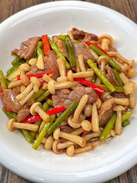 3. Đun nóng dầu, cho thịt vào xào săn lại rồi cho nấm với ngồng tỏi vào xào cùng, nêm thêm 1 thìa nước mắm, 1 thìa dầu hào, một chút muối và hạt nêm, đảo đều xào thêm khoảng 2 phút là xong