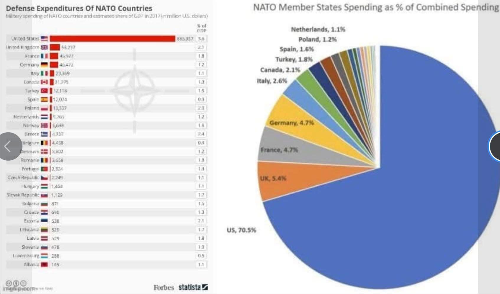 Bởi liên minh thì có đến những 32 nước, mà con số đóng góp kinh phí không được chia đều hoặc phân chia tỷ lệ cho công bằng ..Chỉ một mình nước Mỹ thôi , mà con số đóng góp kinh phí gồng gánh đến 70.5% kinh phí cho 31 thành viên còn lại trong liên minh NATO .