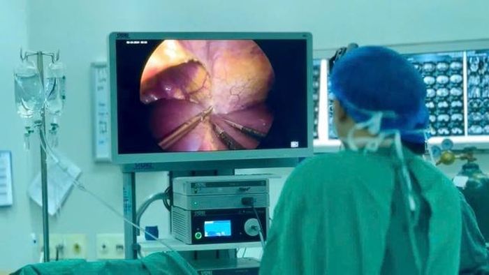 Các bác sĩ tiến hành phẫu thuật nội soi cho bệnh nhân.
