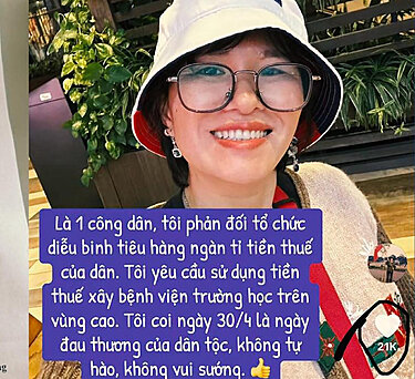 "Là một công dân, tôi phản đối tổ chức diễn binh tiêu hàng ngàn tỷ tiền thuế dân. Tôi yêu cầu sử dụng tiền thuế xây bệnh viện, trường học trên vùng cao. Tôi coi ngày 30 Tháng Tư là ngày đau thương của dân tộc, không tự hào, không vui sướng!"
