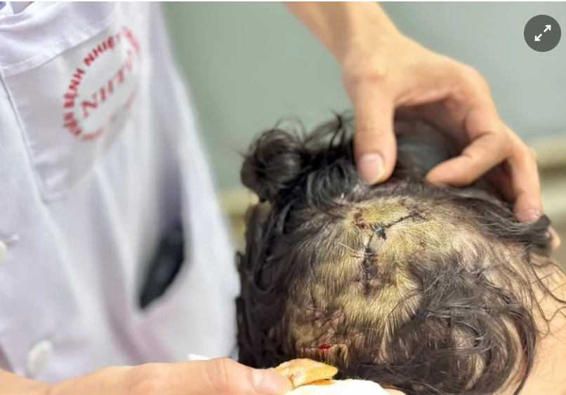 Bé gái 5 tuổi (Hà Nội) bị chó nhà nặng hơn 20 kg tấn công vào vùng đầu, mặt. Khi nhập viện, trẻ có hơn 10 vết thương, trong đó một vết sâu in rõ dấu răng chó. Các bác sĩ đã xử trí cấp cứu, khâu hở khoảng 10 mũi để dẫn lưu dịch và giảm nguy cơ nhiễm trùng.