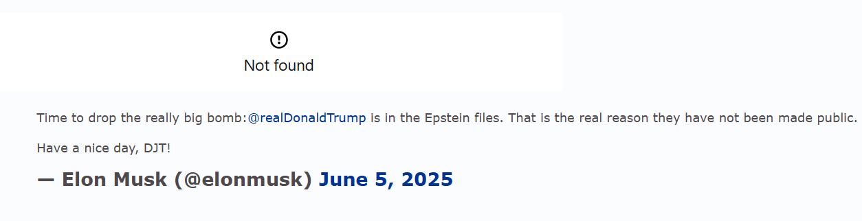 "Hmm... trang này không tồn tại. Hãy thử tìm kiếm thứ gì đó khác", trang X từng hiển thị bài đăng của Musk cho biết.