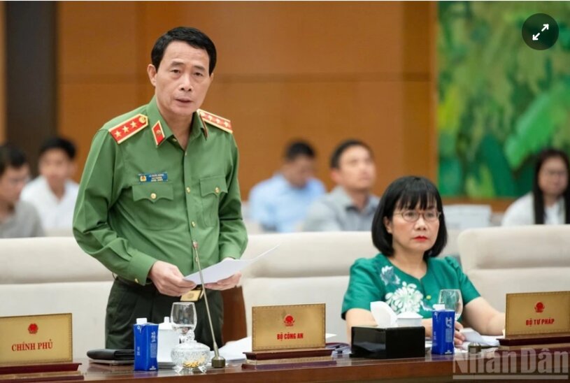 Thứ trưởng Công an Lê Quốc Hùng báo cáo tại phiên họp. Ảnh: Duy Linh.