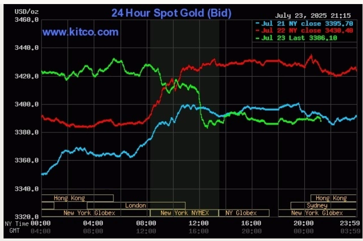 Chốt phiên giao dịch 23/7, giá vàng thế giới giao ngay mất gần 45 USD xuống 3.385 USD một ounce. Đầu phiên, giá có thời điểm lên cao nhất kể từ ngày 16/6.