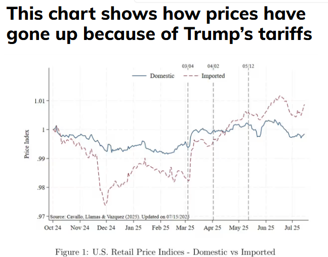 Giá hàng nhập khẩu "phản ứng tương đối nhanh với các thông báo về thuế quan", mặc dù "quy mô tổng thể của những thay đổi này vẫn c̣n khiêm tốn", một nhóm các nhà kinh tế do Alberto Cavallo dẫn đầu và liên kết với Pḥng thí nghiệm Định giá HBS cho biết. Phát hiện này được thể hiện trong biểu đồ trên. Các thông báo về thuế quan được nêu bật trong biểu đồ bao gồm việc Trump áp đặt các mức thuế mới đối với Canada, Mexico và Trung Quốc vào ngày 4 tháng 3; việc ông triển khai các khoản thuế "ngày giải phóng" vào ngày 2 tháng 4; và thỏa thuận của chính quyền ông với Trung Quốc vào ngày 12 tháng 5, trong đó giảm thuế quan cho quốc gia đó.