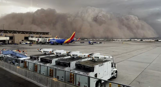 Ngay sau bão bụi ngày 25-8, mưa lớn kèm gió mạnh làm chậm trễ nhiều chuyến bay tại Sân bay Quốc tế Phoenix Sky Harbor và gây hư hại một số khu vực mái nhà ga.