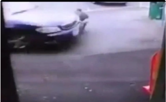 Đoạn phim cho thấy chiếc xe ô tô màu xanh đâm thẳng vào người đàn ông, khiến anh ta ngã xuống đường. Khi anh ấy còn chưa kịp đứng dậy, chiếc xe tiếp tục lùi lại và lao về phía anh một lần nữa.