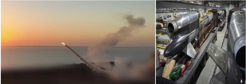Tên lửa hành tŕnh tầm xa Flamingo của Ukraine (trái) ngày 30-8 khai hoả về phía bán đảo Crimea do Nga kiểm soát. Tên lửa hành tŕnh Flamingo của Ukraine (phải) tại một cơ sở lắp ráp bí mật. Ảnh: Chính phủ Ukraine.