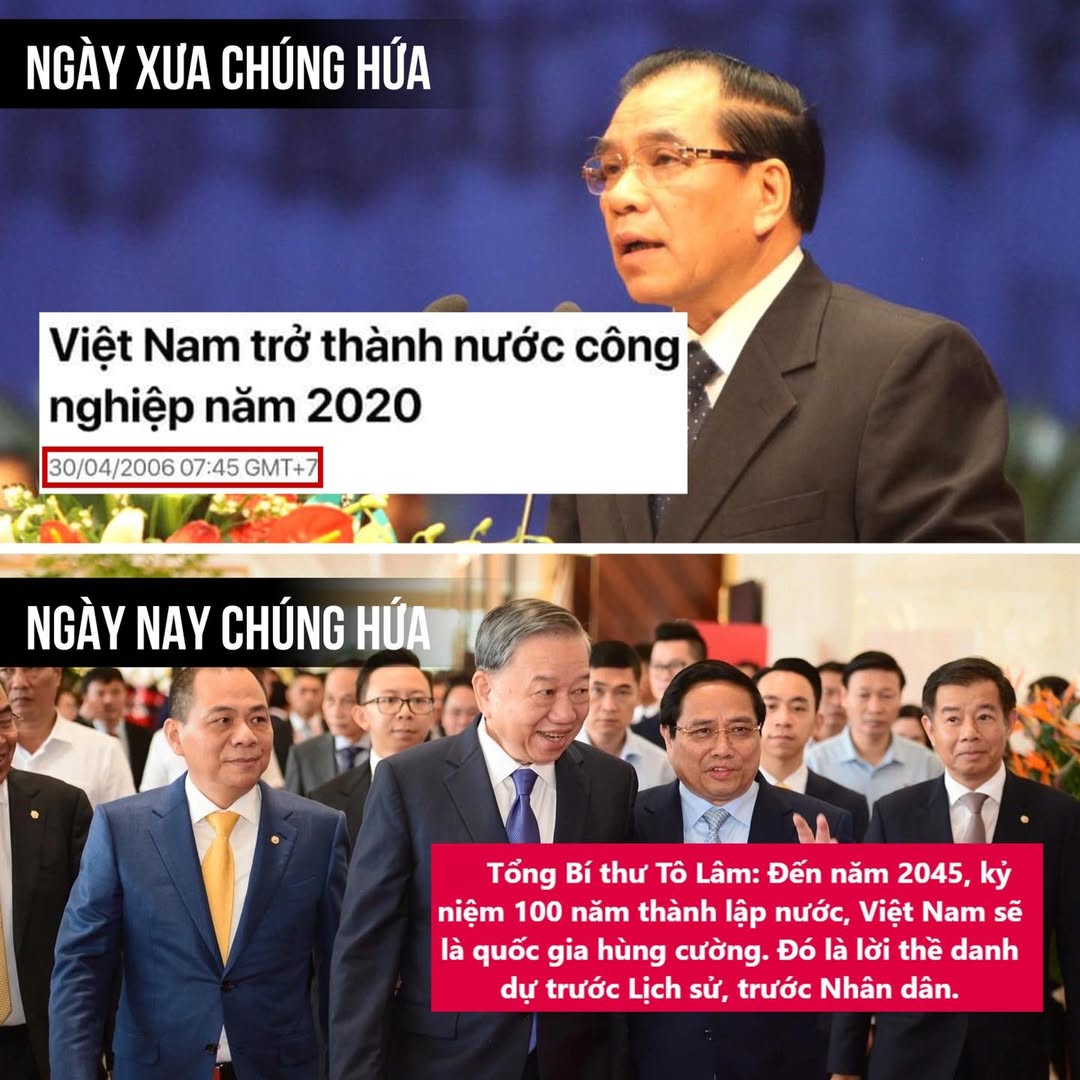Năm 1996, Đảng từng đặt mục tiêu đến 2020 “cơ bản trở thành nước công nghiệp hiện đại”. Người hứa khi ấy là ông Nông Đức Mạnh, được nhắc đi nhắc lại trong mọi nghị quyết. Kết quả là năm 2020 trôi qua, Việt Nam vẫn loay hoay với giấc mơ công nghiệp hóa.