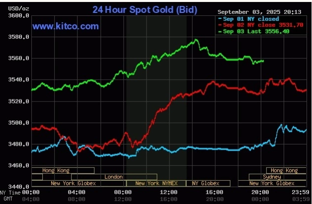 Đóng cửa phiên giao dịch 3/9, mỗi ounce vàng thế giới giao ngay tăng 26 USD lên 3.558 USD. Đây là phiên thứ 2 liên tiếp giá chạm mốc cao kỷ lục mới. Trong phiên, giá vàng có thời điểm lên sát 3.580 USD.