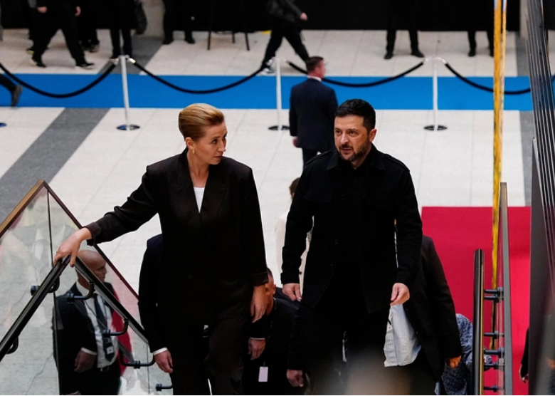 Thủ tướng Đan Mạch Mette Frederiksen (trái) đón tiếp Tổng thống Ukraine Volodymyr Zelensky tại TP Copenhagen ngày 2-10/ Ảnh: AP