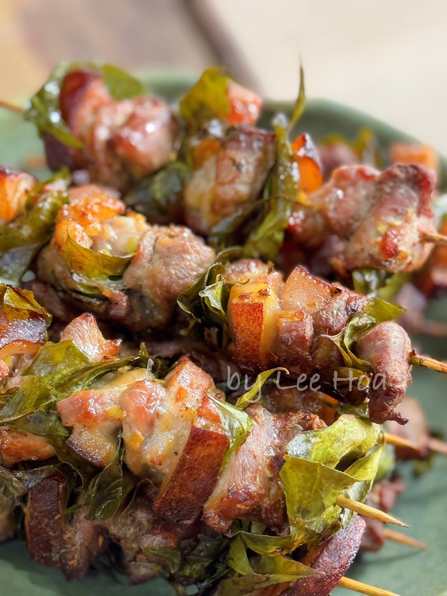 Với công thức này có thể gói thịt lại bằng lá chuối. Đem hấp hoặc nướng với than hoa. Hoặc món dùng xiên nướng bằng nồi chiên với nhiệt 160 độ trong 40 phút.