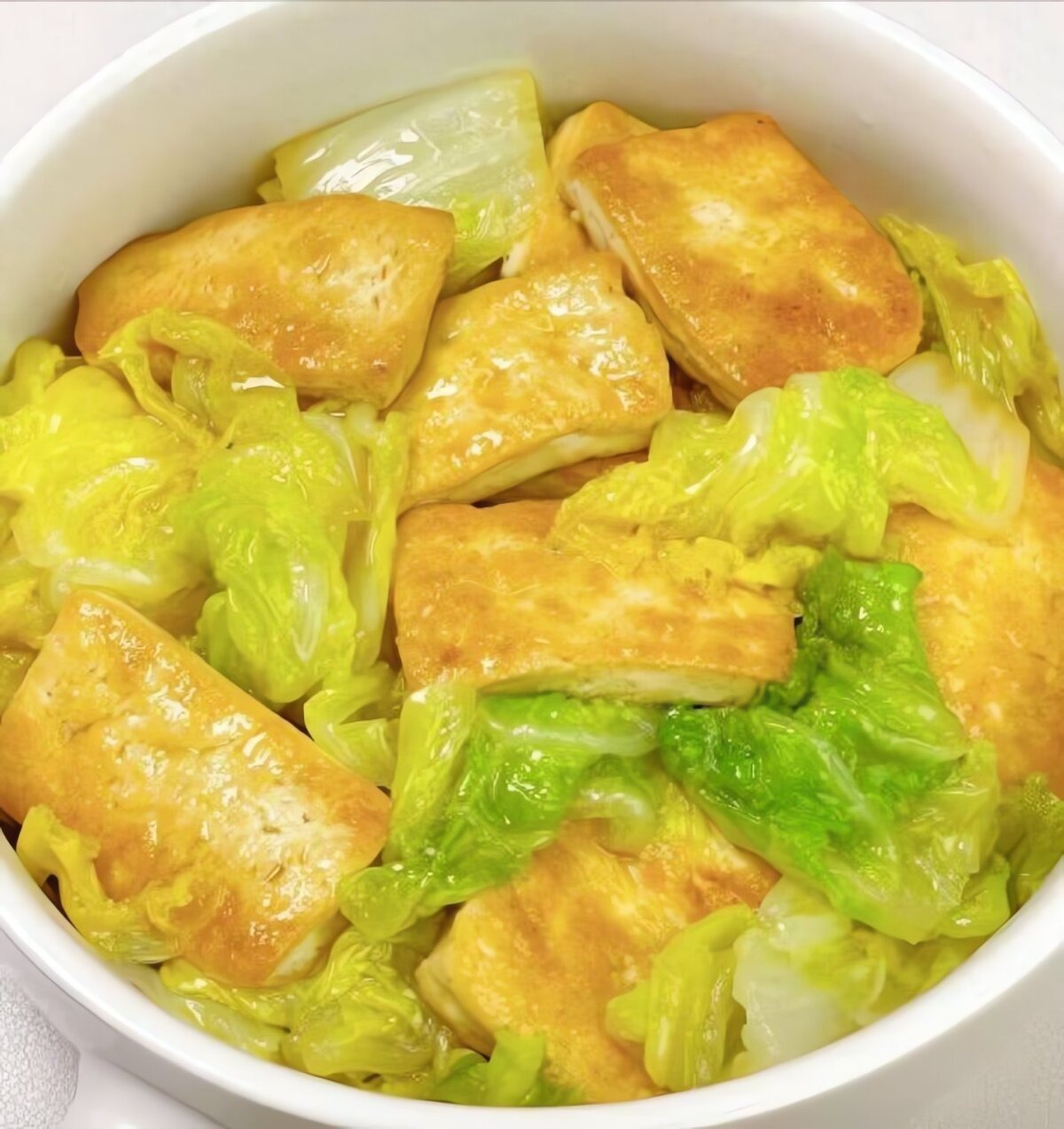 Món cải thảo hầm đậu phụ đơn giản kiểu nhà làm này đã hoàn thành! Đậu phụ được chế biến theo cách này có lớp vỏ ngoài giòn thơm, bên trong mềm mại.