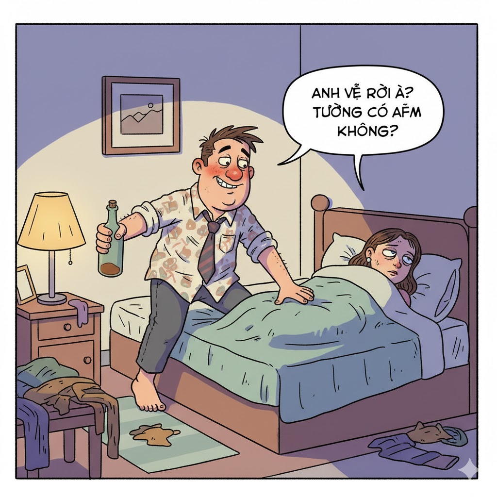 Một ông chồng đi nhậu về khuya, thấy vợ nằm quay mặt vào tường như đang ngủ say.