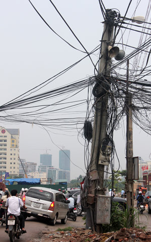 Dây điện từ một chiếc cột nghiêng sà xuống đường, rất nguy hiểm cho người tham gia giao thông, nhất là về đêm.