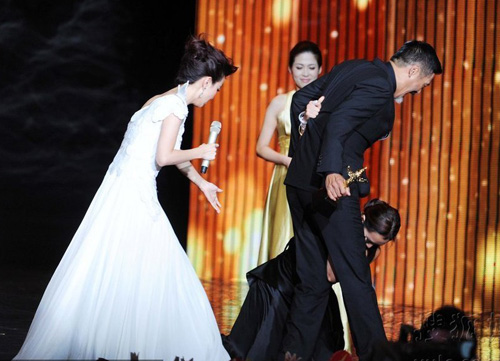 Tuy nhiên, chỉ sau màn chào hỏi, tạo dáng trên thảm đỏ không lâu, Củng Lợi đã phải hết sức bối rối, xấu hổ. Khi bước lên sân khấu cùng các nhân vật đình đám khác, Củng Lợi đã dẫm lên váy dài và mất thăng bằng. Dù đã được Ảnh Đế Châu Nhuận Phát đi cùng hết sức hỗ trợ nhưng siêu sao vẫn bị ngã gục xuống. Cô luống cuống đứng dậy với nụ cười gượng gạo chữa thẹn.