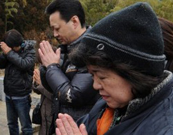 Nhà sư Ryushin Miyabe đang cầu khấn trước bình đựng tro xương của những người đã mất trong thảm họa kép ở vùng đông bắc Nhật Bản cách đây một năm. Các bình này được đặt tại đền Myokoin ở Yamamoto, một thị trấn nhỏ của tỉnh Kagawa thuộc vùng chịu ảnh hưởng trực tiếp của sóng thần. Khoảng 19.000 đã thiệt mạng trong thảm họa động đất sóng thần năm ngoái. Rất nhiều nạn nhân qua đời mà thi thể của họ không bao giờ được người thân đến nhận, bởi vì cũng không còn người thân nào sống sót.