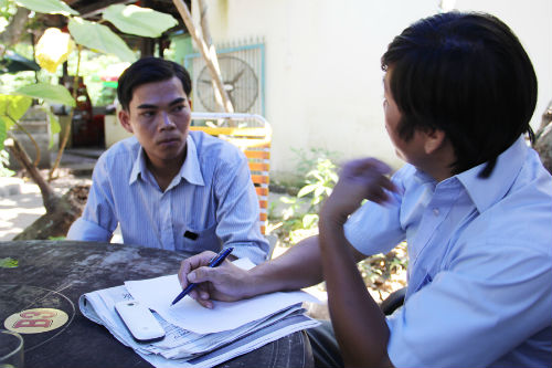 Chồng sản phụ (ngồi ngoài bên phải) trình bày sự việc với phóng viên