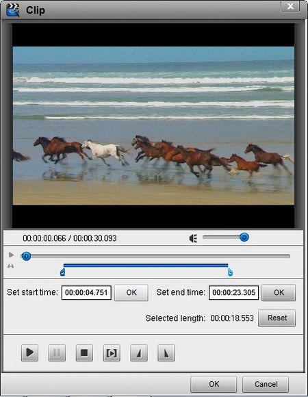 Trên hộp thoại hiện ra, bạn chọn thời điểm bắt đầu và thời điểm kết thúc của đoạn clip cần trích xuất từ file video gốc (sử dụng biểu tượng để đánh dấu thời điểm kết thúc và bắt đầu), sau đó nhấn OK.