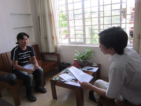 Anh Tâm (mặc áo phông) đang trình bày sự việc với luật sư Trịnh Thanh, Trưởng Văn phòng Luật sư Người nghèo, trưa 13/8.