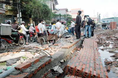 Bức tường bị xô ngã, gạch vỡ ngổn ngang. (Hình: Báo Lao Ðộng)