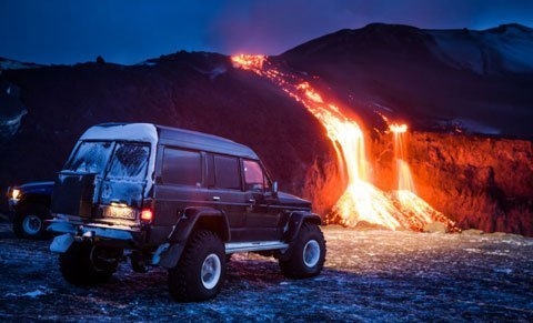 Một dãy xe hơi đậu ngay dưới chân các dòng dung nham nóng bỏng đang chảy tràn từ sườn núi lửa Eyjafjallajvkull. Sự trỗi dậy của núi lửa này lần gần đây nhất vào năm 2010 đã gây hại khắp châu Âu khi làm tung vô số khói bụi lên cao trong bầu khí quyển, gây ô nhiễm môi trường và cản trở hàng không.