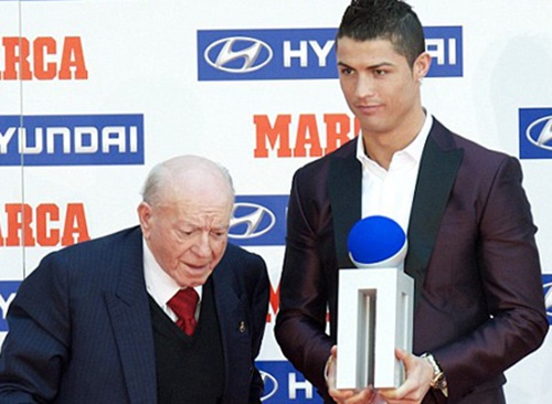 Ronaldo nhận giải thưởng từ chính tay huyền thoại Di Stefano (Ảnh: DM)