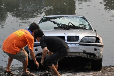 Khi lái thử chiếc ô tô 4 chỗ nhãn hiệu BMW, màu xám ra khỏi showroom, do không quen tay lái, người đàn ông đã để xe lao thẳng qua đường, phi xuống sông Tô Lịch...