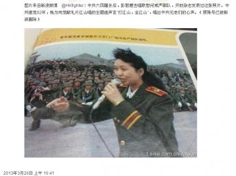 Trên bức ảnh, được lưu truyền trên mạng ngoài lănh thổ Trung Quốc, người ta thấy đệ nhất phu nhân Trung Quốc khi ấy c̣n trẻ, trong bộ quân phục màu xanh, tóc được buộc lại kiểu đuôi ngựa, đứng hát trước các bộ đội đầu đội mũ sắt, tay mang súng trường, ngồi thành hàng dài ngay trên quảng trường Thiên An Môn.