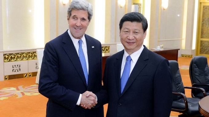 Ngoại trưởng Mỹ John Kerry (trái) trong cuộc gặp với Chủ tịch Trung Quốc Tập Cận B́nh.