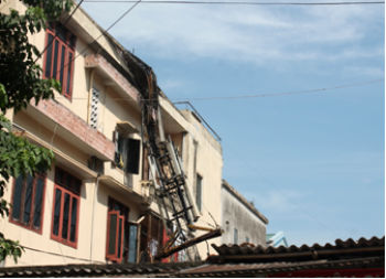 | Trạm phát sóng trên tầng 3 bốc cháy và đổ sập xuống nhà bên cạnh |