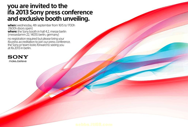 Sony đã chính thức phát thư mời tham gia sự kiện giới thiệu sản phẩm mới đến giới truyền thông. Sự kiện này sẽ bắt đầu vào lúc 21h tối ngày 4/9 (theo giờ Việt Nam), diễn ra tại thành phố Berlin, Đức. Mặc dù không nói rõ sẽ tiết lộ về thiết bị nào, nhưng với hàng loạt tin đồn gần đây, dường như chắc chắn Sony sẽ cho ra mắt chiếc Xperia Honami, cùng với đó nhiều khả năng sẽ là sự xuất hiện của "Lens-Camera" dành cho smartphone.