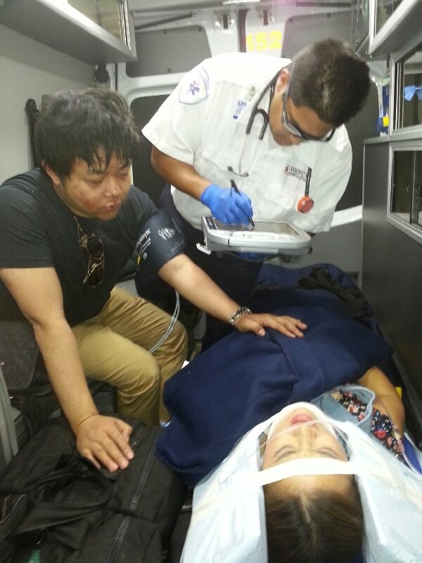 | Quang Lê trên xe cấp cứu. |