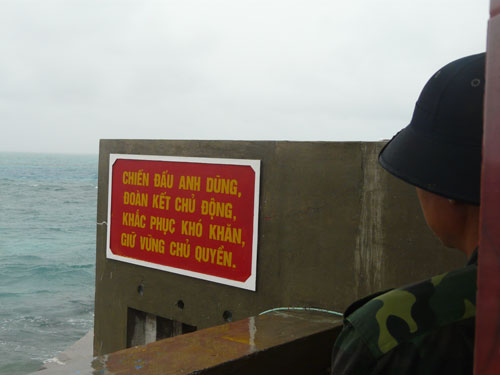 Khẩu hiệu này được chụp tại đảo Đá Lớn, hôm đó trời mưa (ảnh Hồng Chuyên)