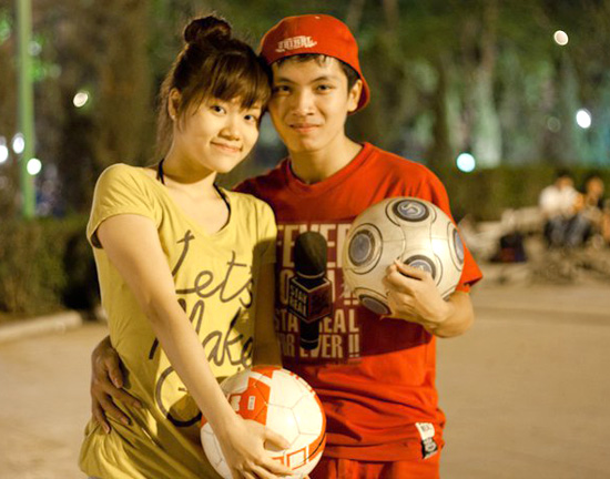 Kim Phúc và cô bạn gái Thu Huyền kết duyên nhờ bóng đá nghệ thuật. Ảnh: KP.