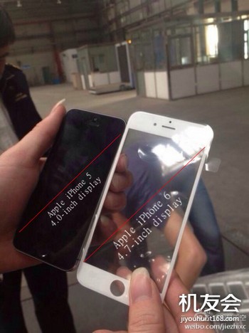 Hình ảnh cho thấy mặt trước của iPhone 6 lớn hơn đáng kể so với màn hình iPhone 5 đặt ở cạnh bên. Tuy nhiên, ngoại trừ sự khác biệt về kích thước, có vẻ như Apple sẽ không có sự thay đổi nào về thiết kế cho phiên bản iPhone mới của mình khi mặt trước của sản phẩm vẫn giữ nguyên phong cách thiết kế như trên iPhone 5 và 5S, với nút Home vật lý nằm ở bên dưới màn hình.