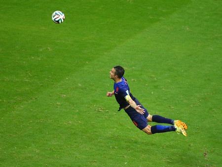 Robin van Persie bay người đánh đầu ghi bàn san hòa 1-1 cho Hà Lan.