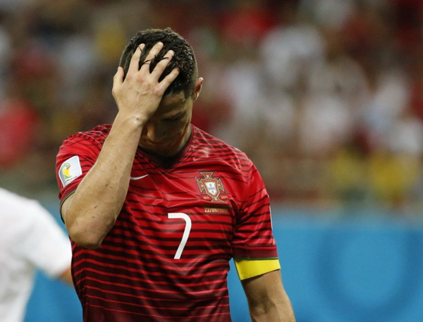 C. Ronaldo ôm đầu, lặng lẽ đi trên sân. Siêu sao Real được mong đợi sẽ tỏa sáng tại kỳ World Cup năm nay nhưng một mình anh cũng không thể giúp Bồ Đào Nha làm nên chuyện.