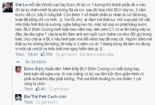 "mỗi lần World cup hay Euro, thì lại có 1 lượng lớn thành phần ất ơ nào đó lại tự nhận mình là yêu bóng đá và coi, sau đó hùa chửi BLV này nọ, 2 năm trước đã có, bây h cũng thế. Còn thêm 1 số thành phần tự nhận là coi đá bóng toàn tắt tiếng chỉ coi hình. ). Xin lỗi chứ, ai đam mê thật sự, mở sopcast chỉ cần nhìn thấy hình thôi là sướng, nghe tiếng reo hò, mặc kệ sop nó phát tiếng nước nào. BLV Biên Cương bình luân bao năm nay, dân xem C1 có ai lên tiếng này nọ đâu, lâu lâu nghe 1 câu lạ lạ thì đám anh em ngồi cười haha coi như đổi gió trong trận, chứ chả ai vì BLV này bình luận mà đổi kênh hay tắt máy cả . Người đam mê thật sự họ không lên tiếng, thì mấy vị 2 năm coi dc 1 tháng bóng đá làm ơn đừng vì một cái cmt tỏ ra hiểu biết mà nguy hiểm làm gì )"