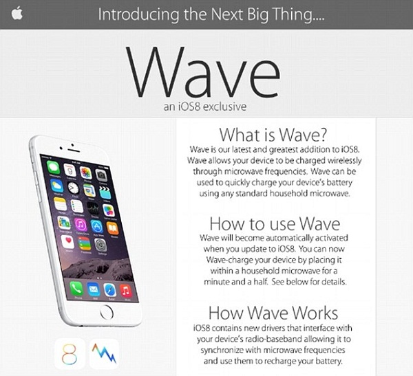 Được đăng bởi một nhóm chuyên chơi khăm trên Internet có tên 4-Chan, quảng cáo về tính năng "Wave" đặc biệt của iOS 8 đã được mô phỏng chính xác theo thông báo cập nhật mới nhất của Apple cách đây một tuần.