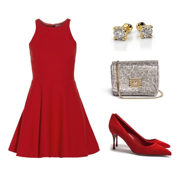 Một set đồ với tone đỏ chủ đạo đậm chất Giáng sinh với hai item chủ đạo tone đỏ là váy liền dáng xòe và giày cao gót da lộn. Để tô điểm thêm sự lộng lẫy cho mình, bạn hãy diện thêm một đôi khuyên tai hạt đá đơn giản và clutch ánh kim. Set đồ này vô cùng thích hợp với những cô nàng nữ tính, yểu điệu.