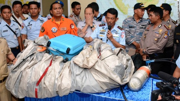 Một nhân viên Air Force, Indonesia đang nói về các mảnh vỡ, bao gồm một chiếc vali được t́m thấy trôi nổi gần khu vực QZ8501 mất tích. Cơ quan t́m kiếm và cứu hộ Indonesia xác nhận các mảnh vỡ t́m thấy là của chiếc máy bay.