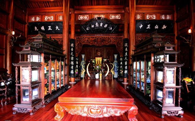 Đặc biệt, nhiều vật dụng được làm từ gỗ nguyên khối như tấm phản rộng 3 m. Nhiều bức tranh trạm trổ băng gỗ nguyên khối mô phỏng nhiều khung cảnh trong tích truyện cổ. Toàn bộ tủ, kệ, sập được khảm trai. Ngoài ra, hầu hết xà ngang, bậc cửa đều có các họa tiết, từ "long, ly, quy, phụng" tới "tùng, cúc, trúc, mai" hay đủ loại chim thú, hoa lá cỏ cây.
