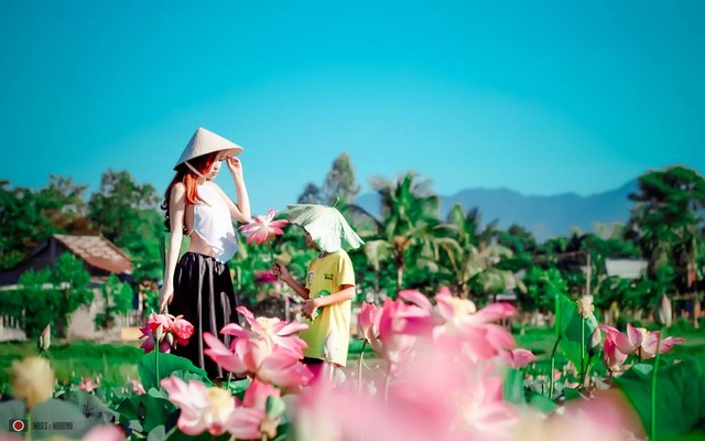 Bộ ảnh được thực hiện tại Điện Hồng, Quảng Nam. Khung cảnh vườn quê xanh mát với hồ sen, hành chè tàu và cây cau rợp bóng nơi đây đã tạo ra nét duyên dáng, thi vị.