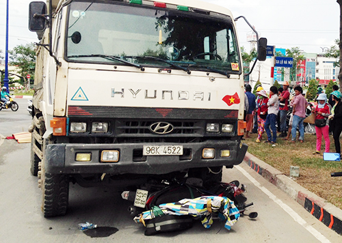 Nạn nhân khoảng 30 tuổi bị bánh xe ben cán qua, tử vong tại chỗ. Còn xe máy phía sau có buộc vali bị kéo lê một đoạn hơn 10 m, hư hỏng nặng. Sau tai nạn, tài xế xe ben rời khỏi hiện trường.